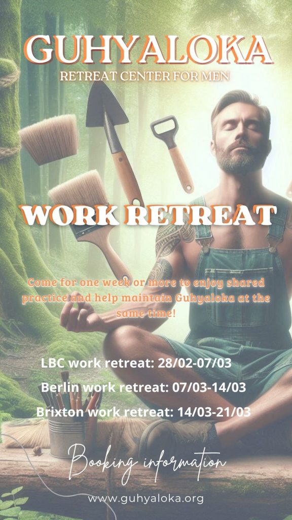 Dies ist ein Retreat, das allen Männern in Triratna offensteht. Wir werden an vier Vormittagen körperlich arbeiten. Wenn Du also Rückenbeschwerden hast oder Dich körperliche Arbeit schmerzt, ist dieses Retreat wahrscheinlich nicht das Richtige für Dich.